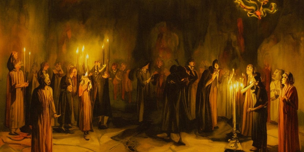 Riehl began reading from a large tome in Latin—it was clear he was showing off the fruits of a private education. The rest of the enrobed attendants repeated back what Riehl said in a low, melodic tone. The monk in the glasses stayed in the back, silently observing. Riehl stopped speaking for a moment, produced a small figurine in the shape of a man, and placed it in the center of the altar. He issued a command with a wave of his hand to some unseen henchmen and stepped back from the altar.